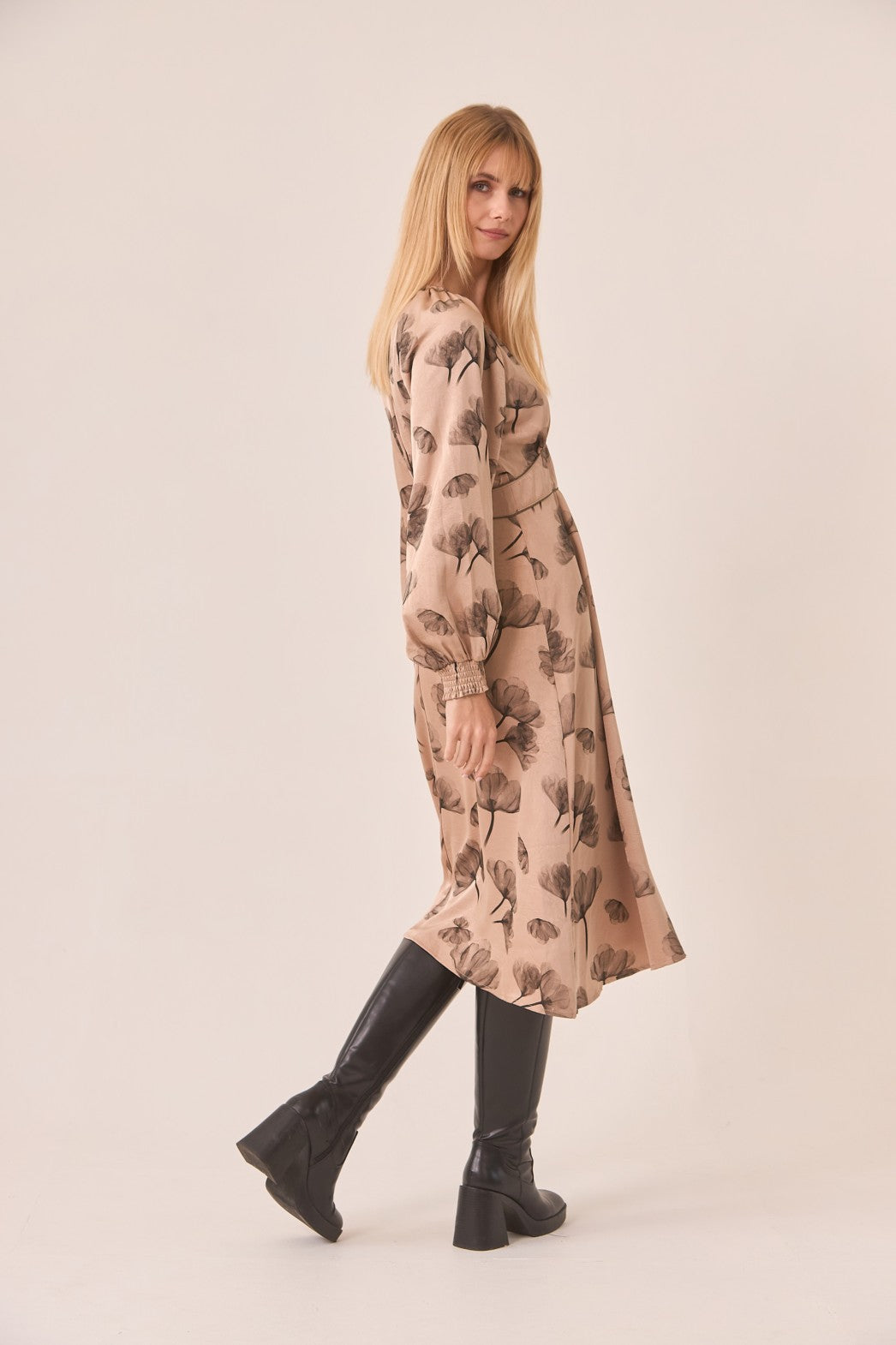 Vestido midi de manga larga abullonada con goma fruncida en los puños. Escote V con botones sobre el pecho. Cintura ajustada.