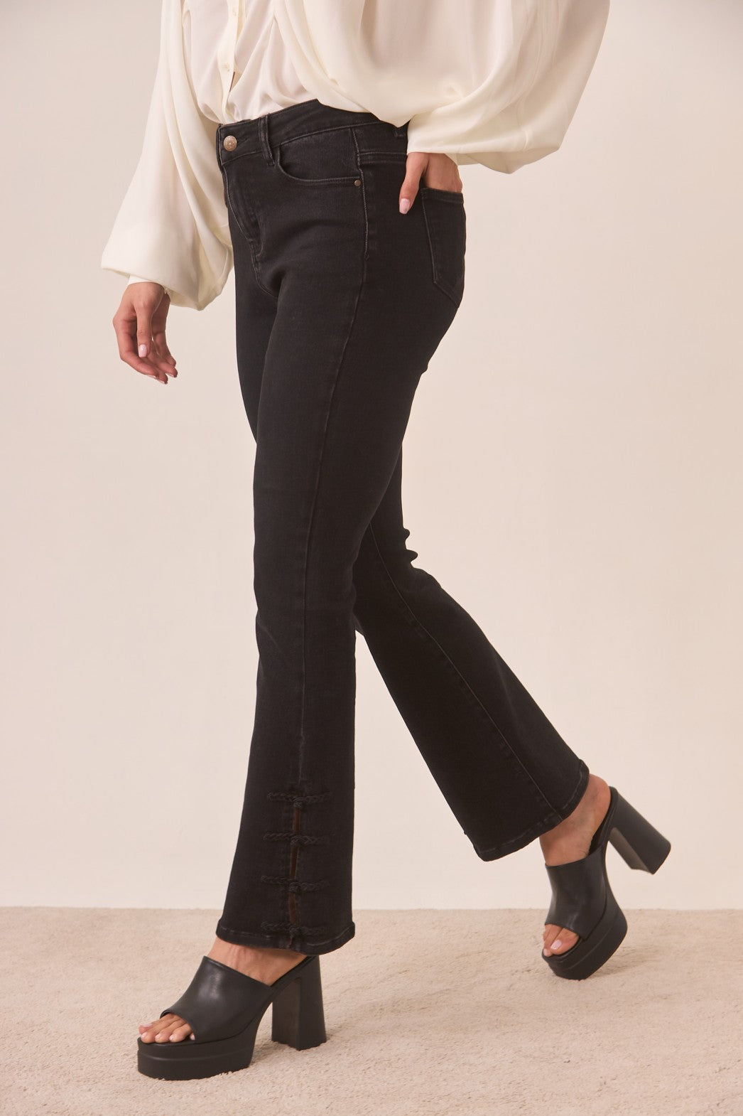 Pantalón en tejido denim de tiro medio con bajos acampanados y detalle de aberturas laterales cerradas con botones de cordón trenzado al estilo oriental. Cierre de botón y cremallera.