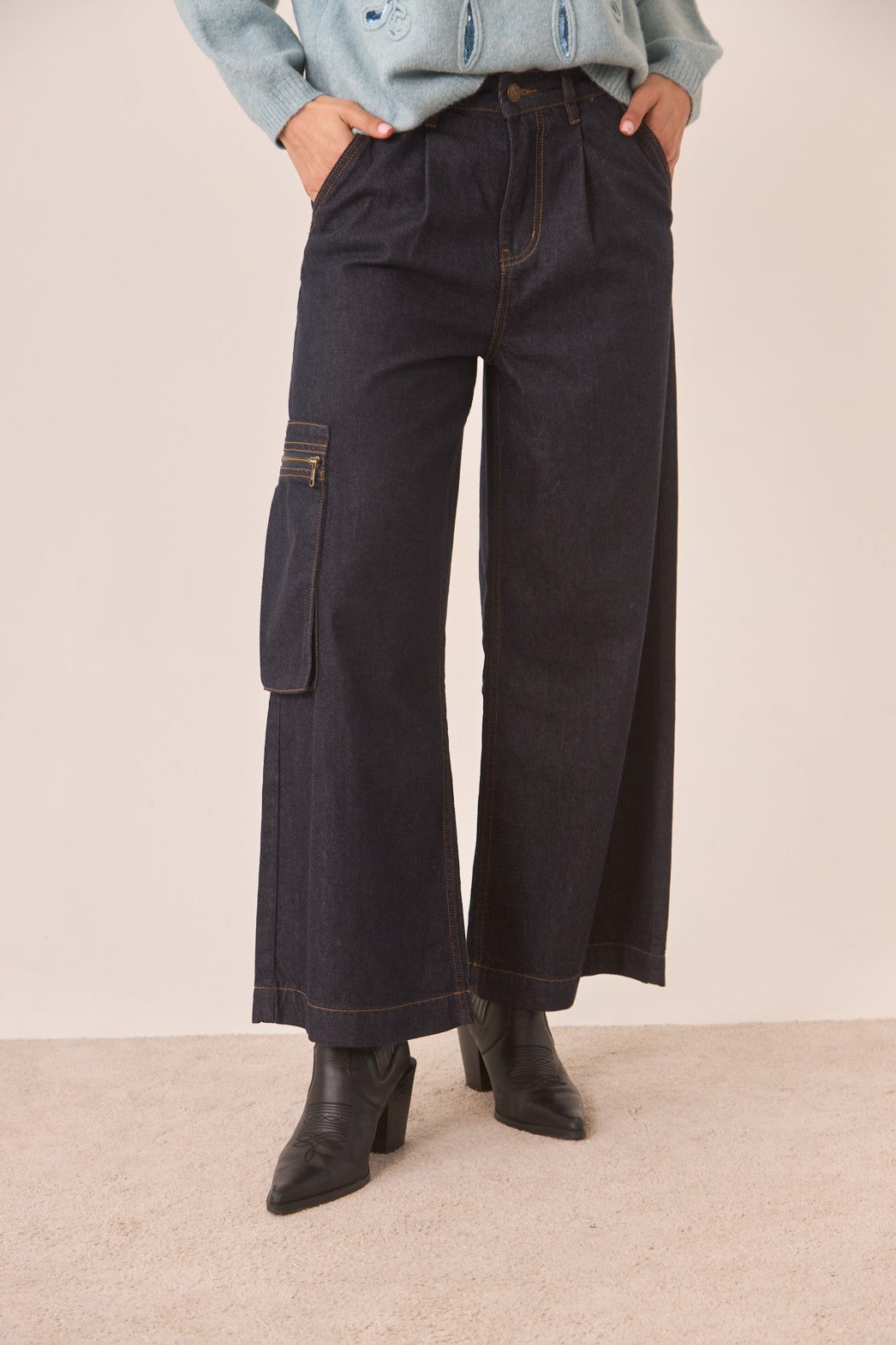 Pantalón en tejido denim de tiro medio wide leg cargo con bolsillo de cremallera lateral. Cierre de botón y cremallera.