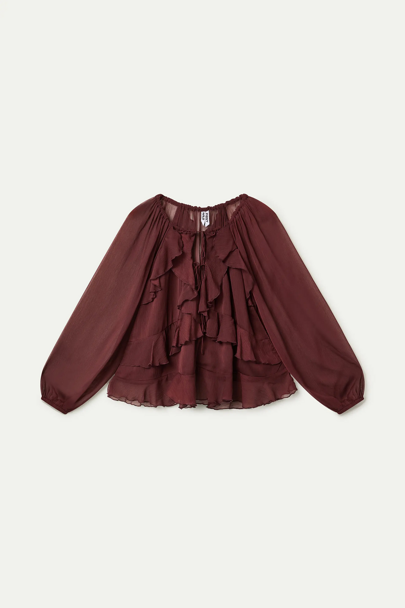 Top chiffon de color marrón. Cuello escote pico y anudado con volantes. Manga larga y forro interior.