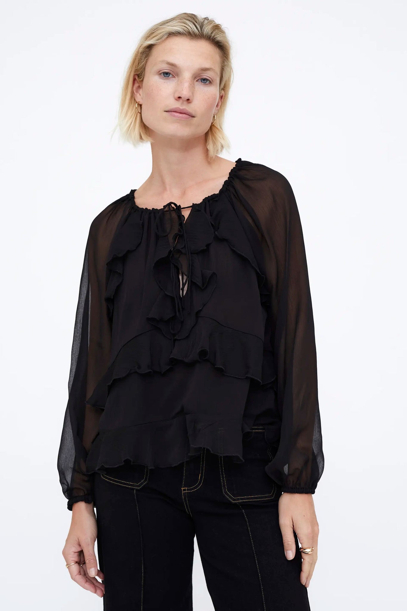 Top de chiffon color negro. Cuello barco con escote pico anudado con detalles en volantes. Manga larga transparente. Forro interior.