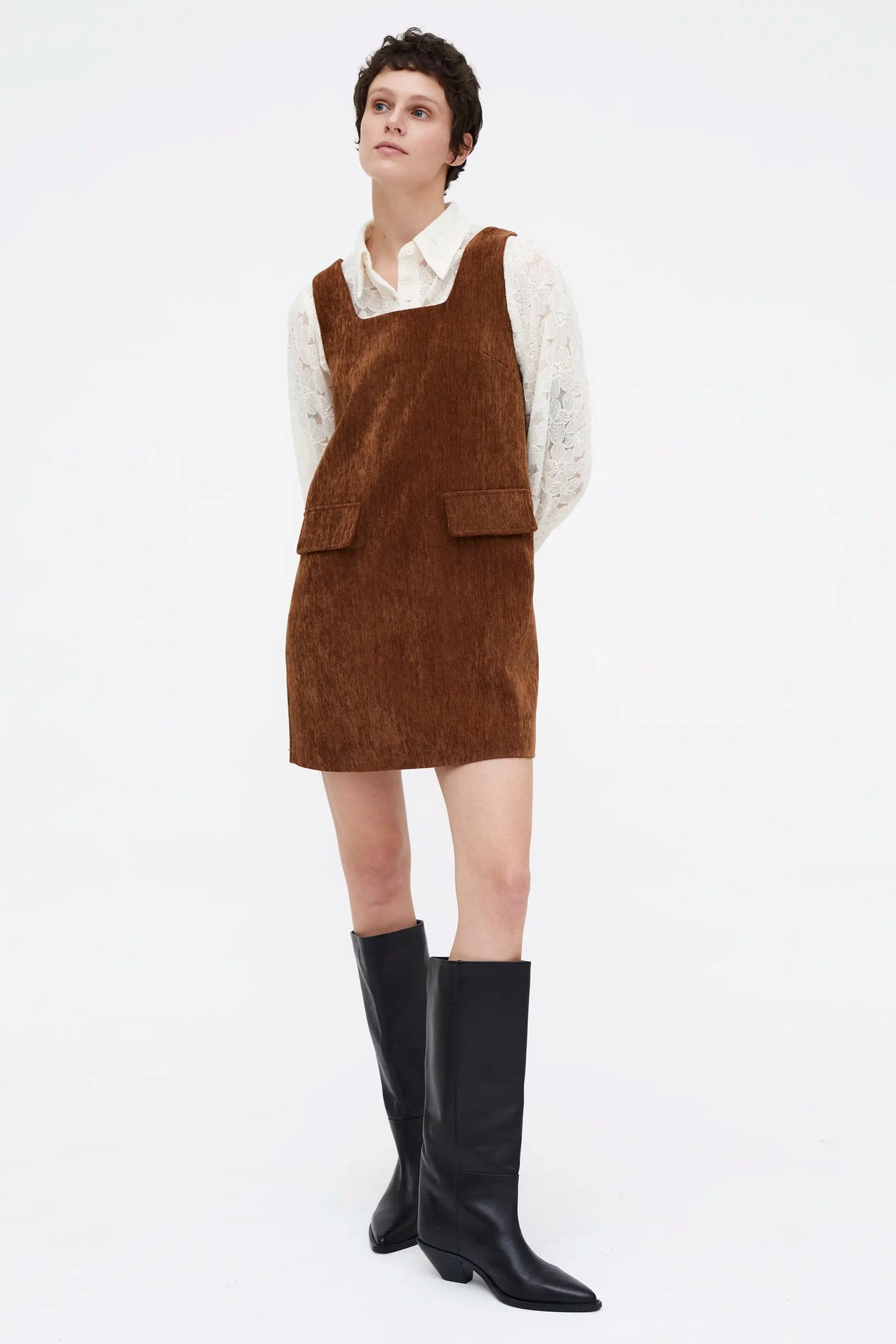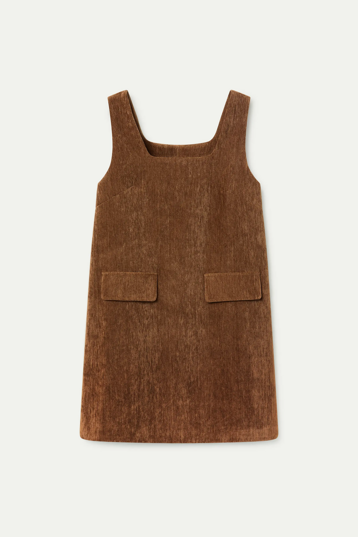 Vestido corto efecto aterciopelado de color marrón. Diseño sin mangas. Bolsillos laterales decorativos.