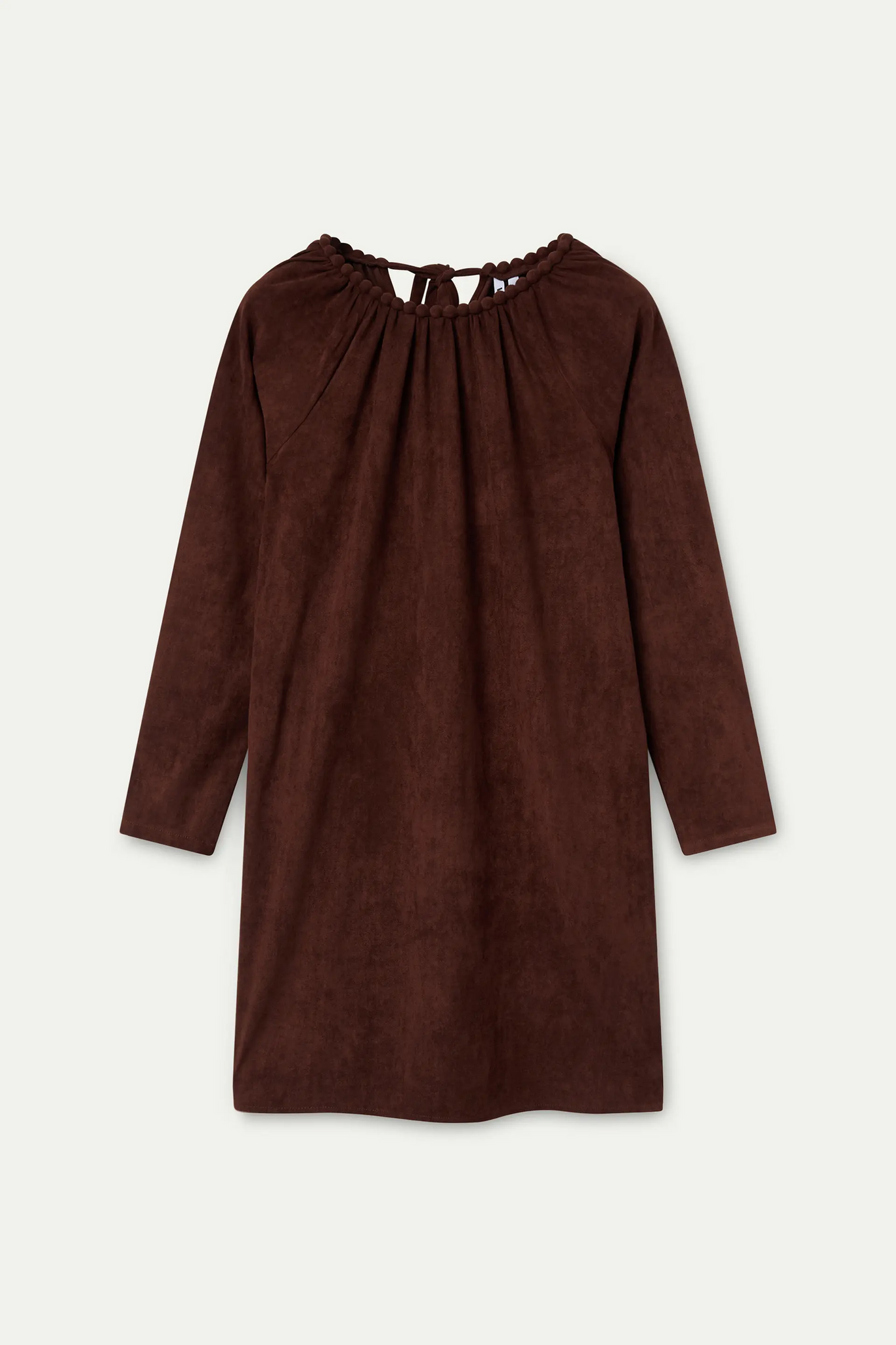 Vestido corto fluido ante color marrón. Con cuello redondo trenzado y escote pico anudado en la espalda. Manga larga amplia y bolsillo lateral.